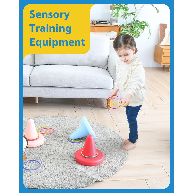 FAHKNS Sensory Spinning Toy with 16 Ring Toss Set, Sit and Spin Swivel Chair for Training Balance, One-Horned Sensory Chair for Autistic Children, Develop Coordination 8PCS