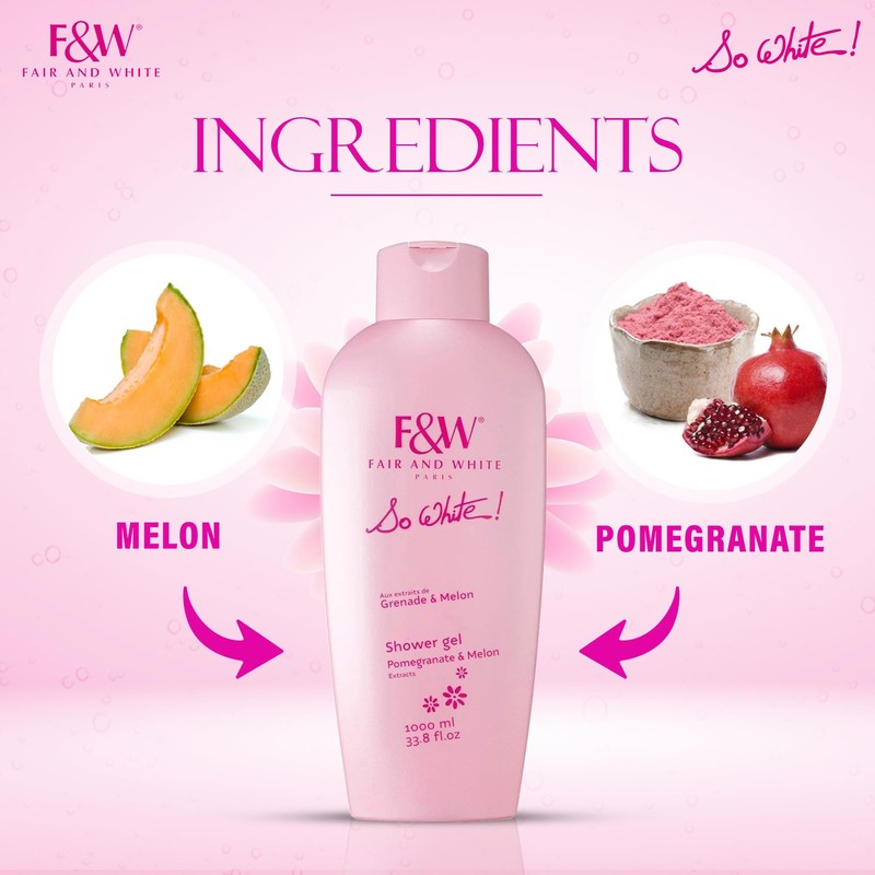 - SO WHITE SHOWER GEL UNIQUE FORMULA: is infused with a revitalizing blend of Pomegranate and Melon extracts designed to pamper and uplift your mood. Hydrating glycerin properties leave your skin feeling silky, soft and smooth, all day long.