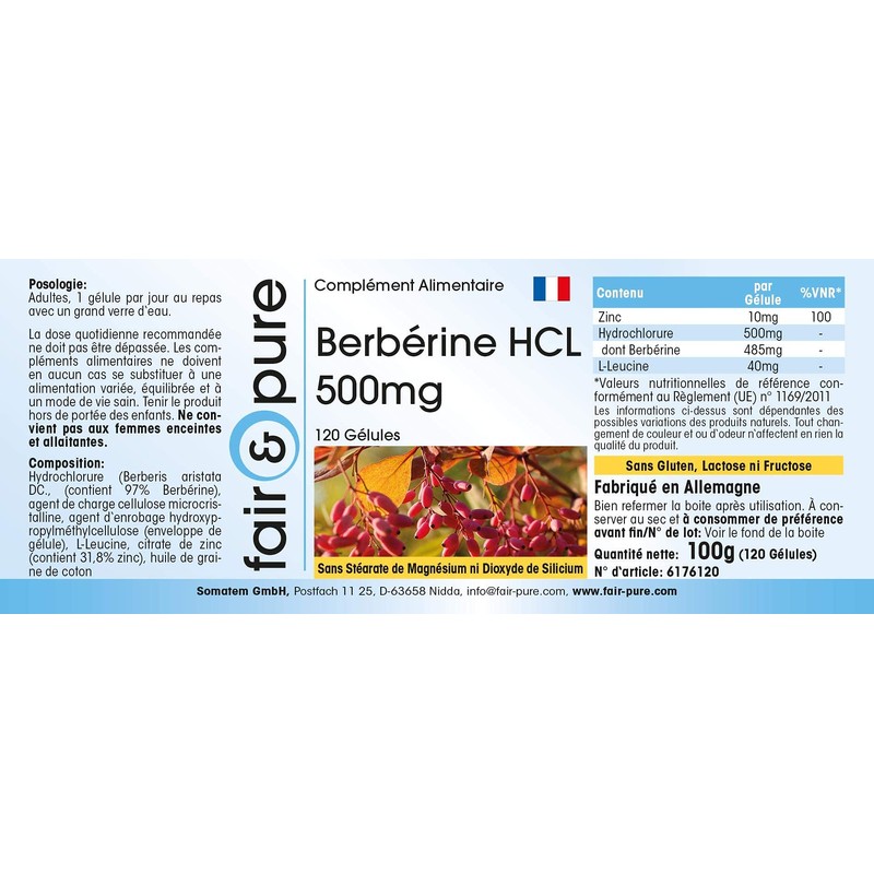 - For your health: berberine HCl with zinc, 180 capsules - the product is gluten-free, lactose-free, fructose-free and free from magnesium stearate, silicon dioxide, colourings, flavours and preservatives