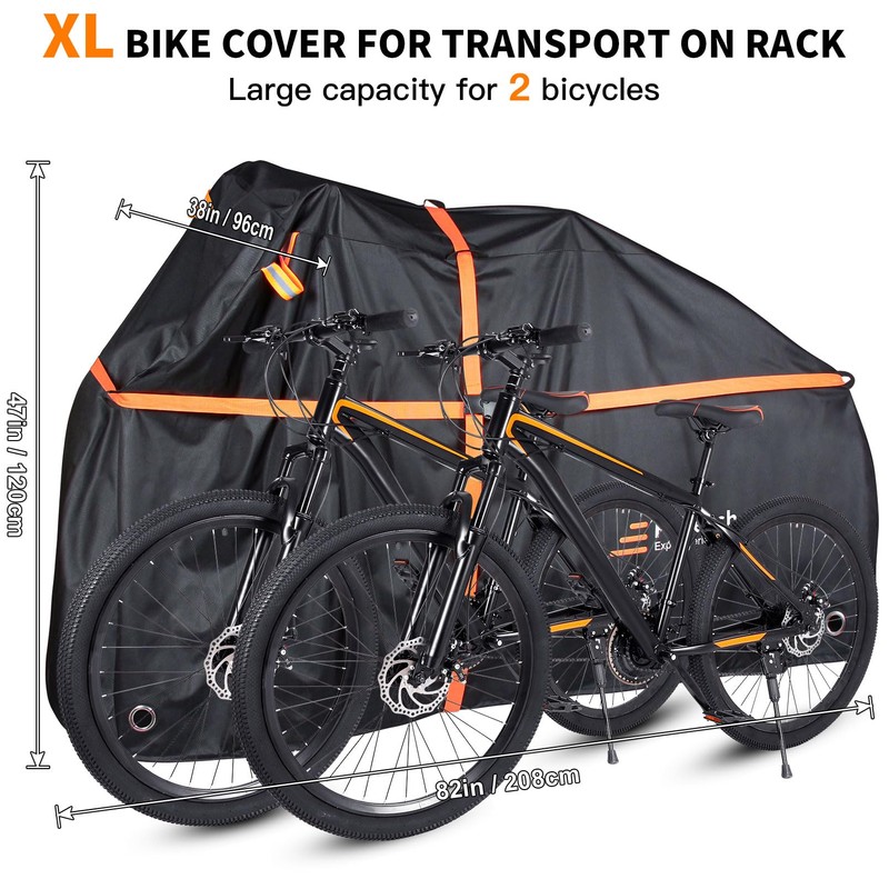 - Bike Cover for Transport on Rack: This 82" x 38" x 47" bike tarp fits up to two bikes and is suitable for electric bikes, road bikes, mountain bikes, hybrid bikes, and beach cruisers. Arrange bikes side by side or upside down for optimal coverage. Ensure your bikes' combined size before make an order.