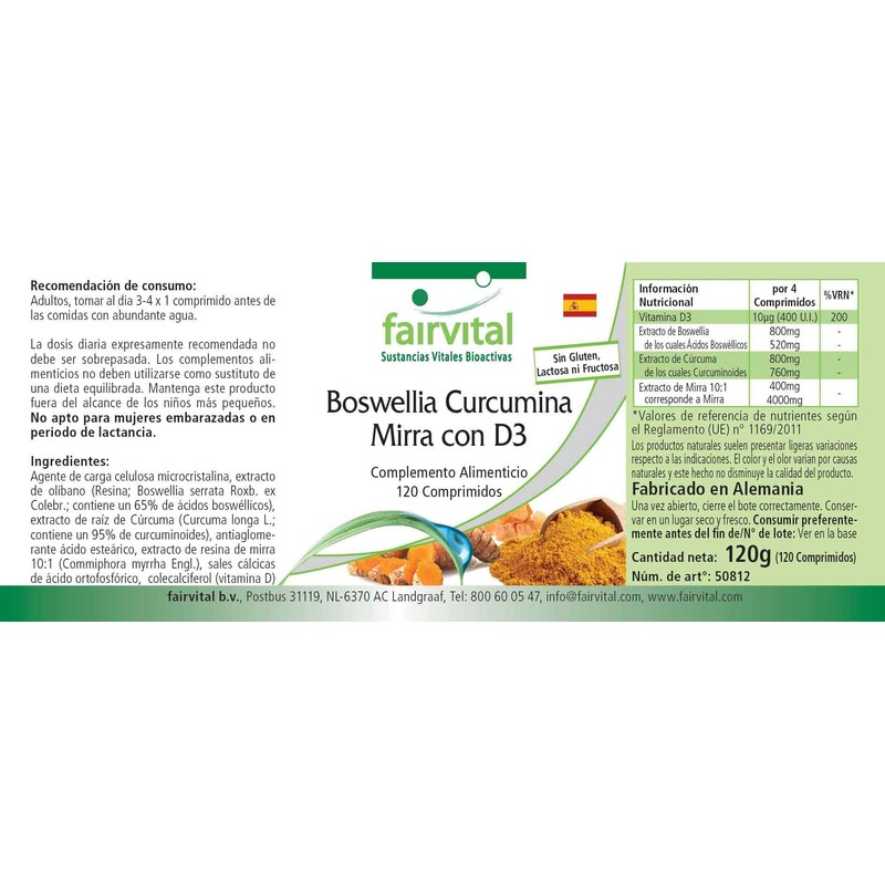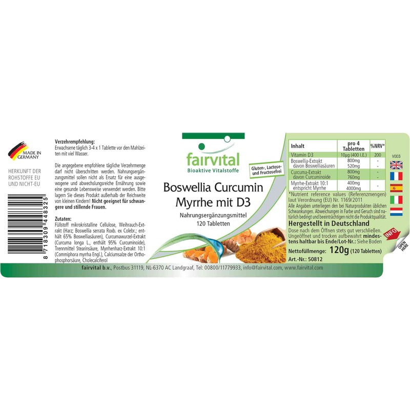 - ✔ Fairvital GERMAN QUALITY: Daily dose: 4 tablets daily contain 10µg vitamin D3, 800mg boswellia extract, of which 520mg boswellic acids, 800mg curcuma extract, of which 760mg curcuminoids, 400mg myrrh extract, equivalent to 4000mg myrrh. Highly dosed! Excellent price-performance ratio!