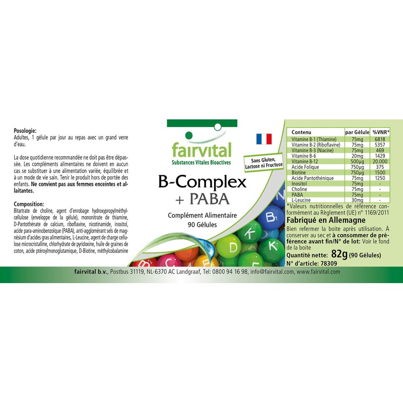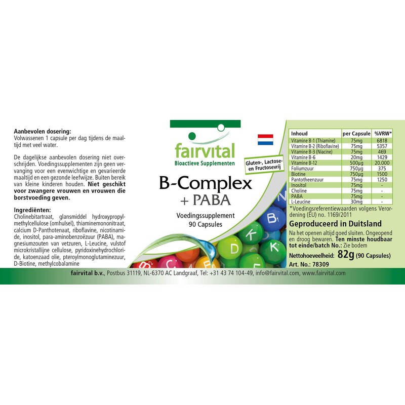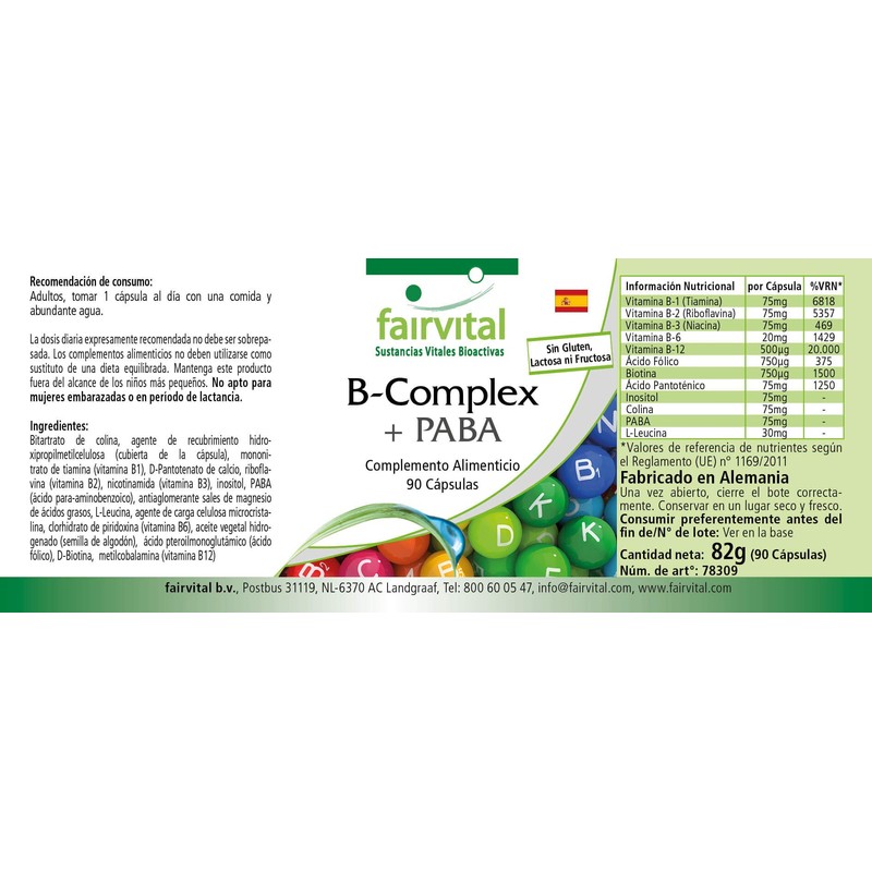- ✔ fairvital German quality: daily dose: 1 capsule per day contains 75mg vitamin B1, 75mg vitamin B2, 75mg vitamin B3, 75mg vitamin B6, 500μg vitamin B12, 750μg folic acid, 750μg biotin, 75mg pantothenic acid, 75mg inositol, 75mg choline. and 75mg PABA High dose. Excellent value for money! B vitamins contribute to the reduction of fatigue and fatigue.