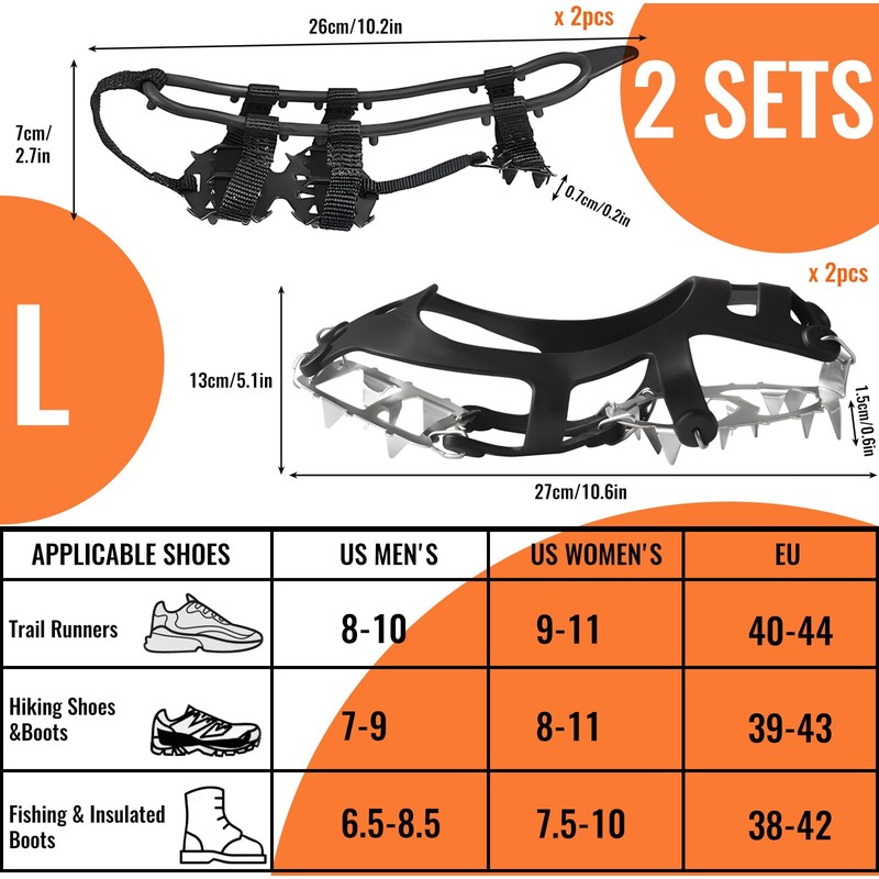 - 2. [2 pairs] There are 2 pairs of crampons in different designs, with different weights, materials and spike sizes, so they are suitable for different roads and scenes. You can choose which pair of shoes you want to wear when going out according to your needs.