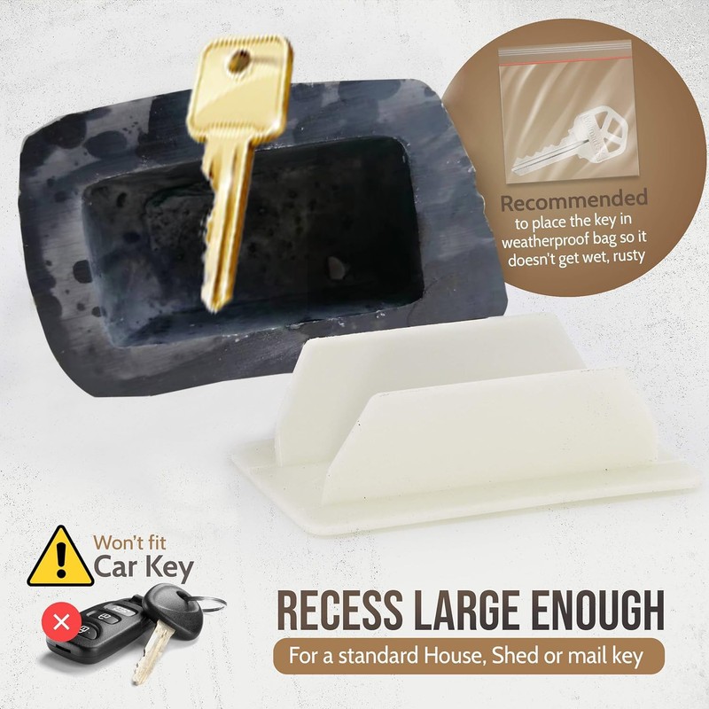 • Key hiders outside decorative, goes 'undercover' among shrubs, grass or landscape rocks/wood chips. The key hider measures 4" L x 2 ¾ “ W x 1 ¼" H, 4 oz