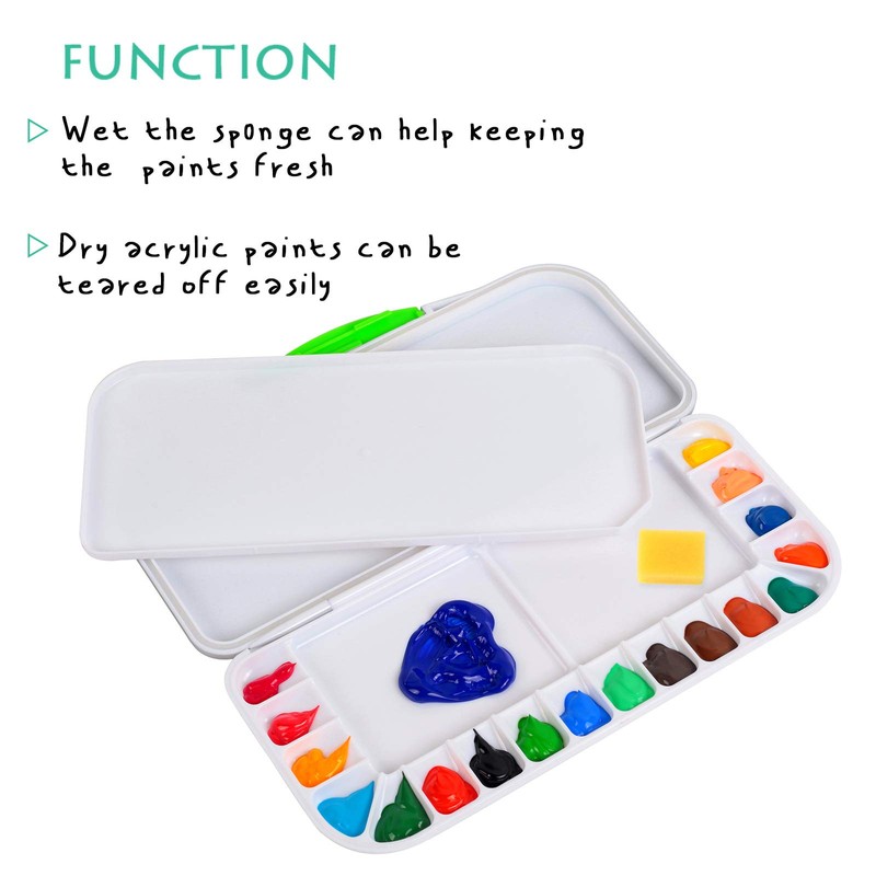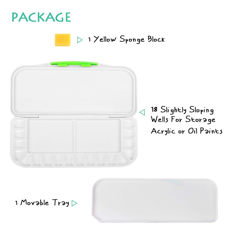 • 18 individual compartments of various sizes can well hold the paints, ideal for watercolor and acrylic paints