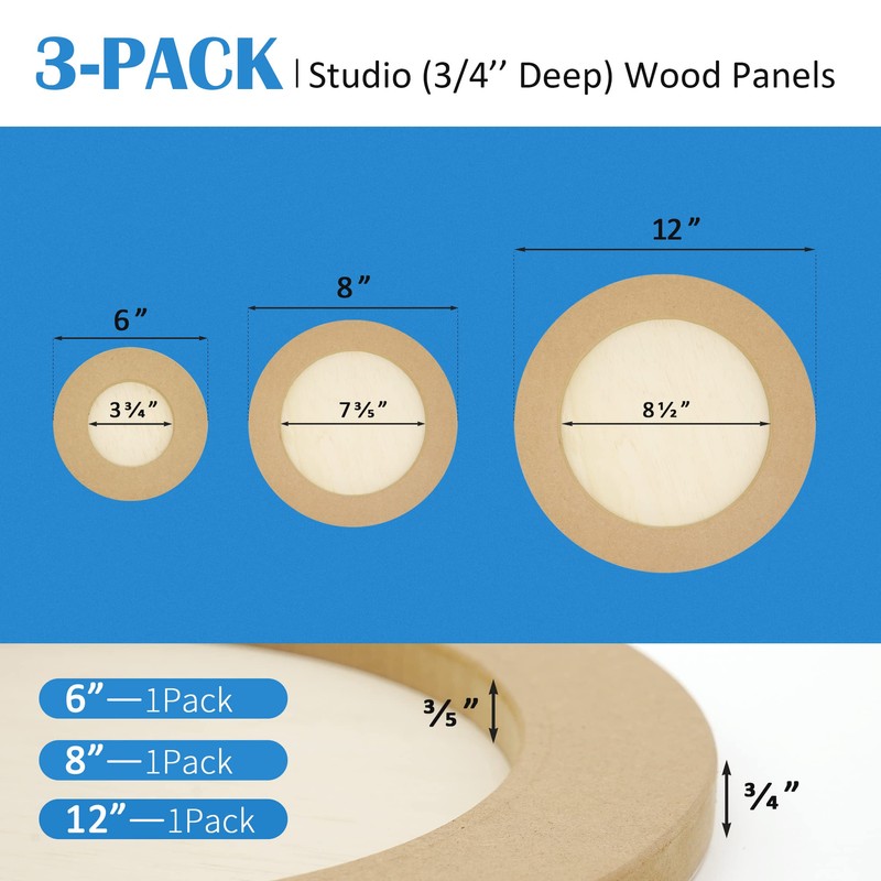 - What You Can Receive: This set includes 3 pcs round cradle panels of 6", 8", and 12", which can meet your daily needs and replacement. They are all in 3/4" depth. Multifunctional wooden canvases are not only used for artistic creation, also as trays to store or organize your small painting accessories, sewing supplies and more.