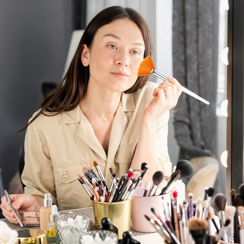 - Portable Size The size of a single fan brush is about 14.5 x 5 cm, so it is convenient to carry and store in a cosmetic bag to avoid dirt pollution. After use, rinse with warm water, which is convenient and fast, and reusable.