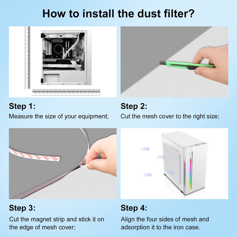 • DIY MULTIPLE SIZE: 2 pack 500mm 19.68inch pc computer case dust filter mesh cover with 3m 118 inch magnetic strip along, you can diy and build your own dustproof system easily.