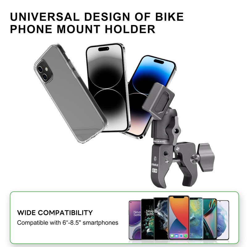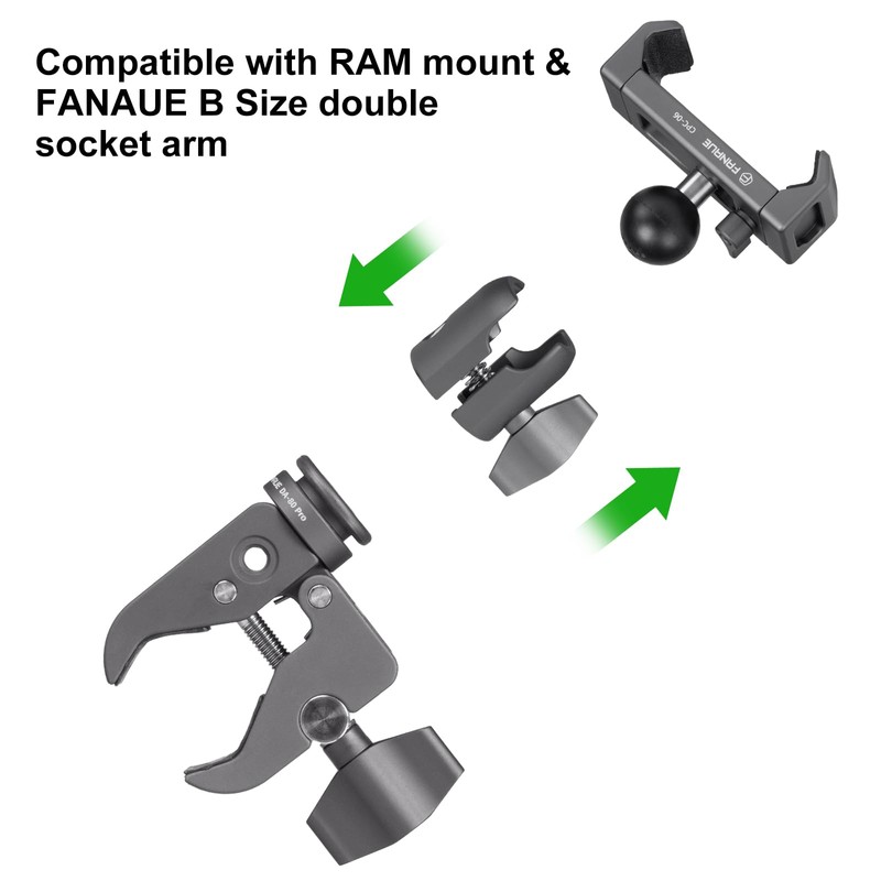 Lifetime warranty: FANAUE brand has been bringing good experience to users since its launch, and we provide lifetime warranty service. Sturdy and safe: This motorcycle phone holder is made of high-quality alloy and stainless steel to ensure durability and reliability during riding. The phone holder is also equipped with soft silicone to tightly wrap your phone and can protect your phone camera. The handlebar phone holder and phone camera adopt non-contact design to prevent the phone camera from being squeezed and scratched during riding Double-layer shockproof protection: Both corners of the phone clamp are covered with cushioning rubber pads to prevent your phone from falling. The handlebar clamp ensures your phone remains safe and visible during riding, and the strong spring is matched with an adjustment lock. Ensure that your phone is protected even when riding at high speeds. Wide compatibility:The phone holder with 1 inch ball head adapter can be used for bicycles, motorcycles, ATV/UTV, scooters, strollers, treadmills and other vehicles, suitable for 6-8.5 inch smartphones, support device thickness of 20mm, such as: like iPhone 15/ 14/ 13/ 12 Pro Max, iPhone 16 Pro, iPhone 16/ 15/ 14 Plus, iPhone Xs, Xs Max and more. Compatible with RAM mount B Size ball head:Motorcycle phone mount compatible with ram accessories, 1 inch ball adapter can be rotated 360°, free to adjust the horizontal or vertical direction,the high-quality non-slip rubber wraps the stainless steel ball head, which plays a very good role in protection, and fits the ball joints perfectly, making it more stable safety. One-Handed Operation:This phone mount for motorcycle adopts upgraded handlebar clamp and security lock. Easily insert or remove your phone with just one hand in one second, making it extremely convenient. The ball articulating arm provides lots of flexibility for angling and getting in the right place. With a 360° rotation design, adjusting the smartphone to a horizontal or vertical screen is effortless. Enjoy a pleasant and easy riding experience. Shock Absorption Silicone: The four corners of phone clamp are covered with cushioned rubber pads, protect your phone from crashing. The handlebar clip is also covered with no-slip pads, making sure your phone stays secure and visible during riding. Ensuring your phone stays protected even at high speed.