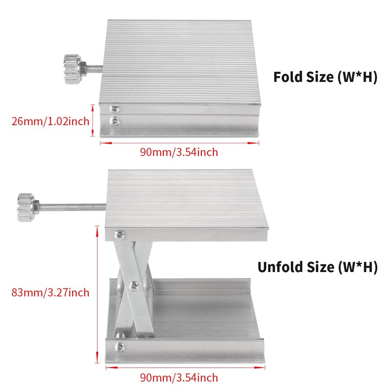 - 【Specifications】The material of the lab lifting stand rack lift platform is Aluminum. The fold size is about 90x26mm/3.54x1.02inch, and the unfold size is about 90x83mm/3.54x3.27inch.