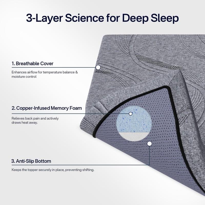 - Copper-Infused for All-Night Cooling: Our innovative copper-infused memory foam mattress topper actively draws heat away from your body, regulating temperature all night long, perfect for hot sleepers.