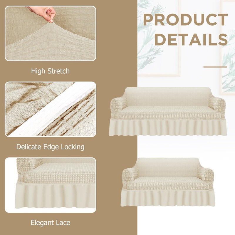 - Value Pack: you will receive 2 piece sofa set for living room cover; The beige couch covers are made of quality fabrics and are suitable for 2 seats sofas and 3 seats sofas; The arm chair slipcover come with an elegant skirt and will give your home a different look
