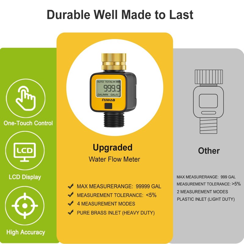 - DURABLE AND IPX6 WATERPROOF: FANHAO Water flow meter has pure brass inlet and outlet with metal thread, which will not rust or wear out and is more durable and long-lasting. Rugged design with premium heavy-duty ABS material, this water meter is weatherproof and durable, great to resist UV, sunshine, and rain. The IPX6 waterproof grade ensures more stability for outdoor use.