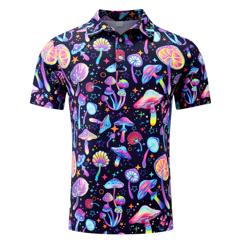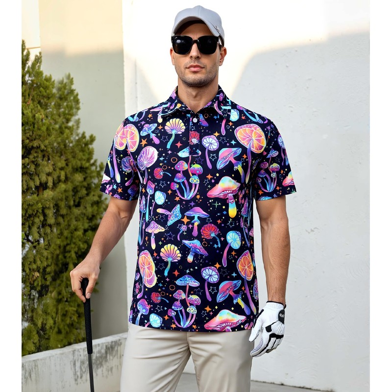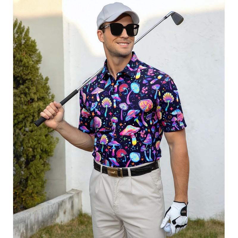 Fanient Men Golf Shirts Dry Fit 3D Mushroom Polo Shirts Short Sleeve 3D Print Moisture Wicking Performance 4-Way Stretch Soft Tops XXL