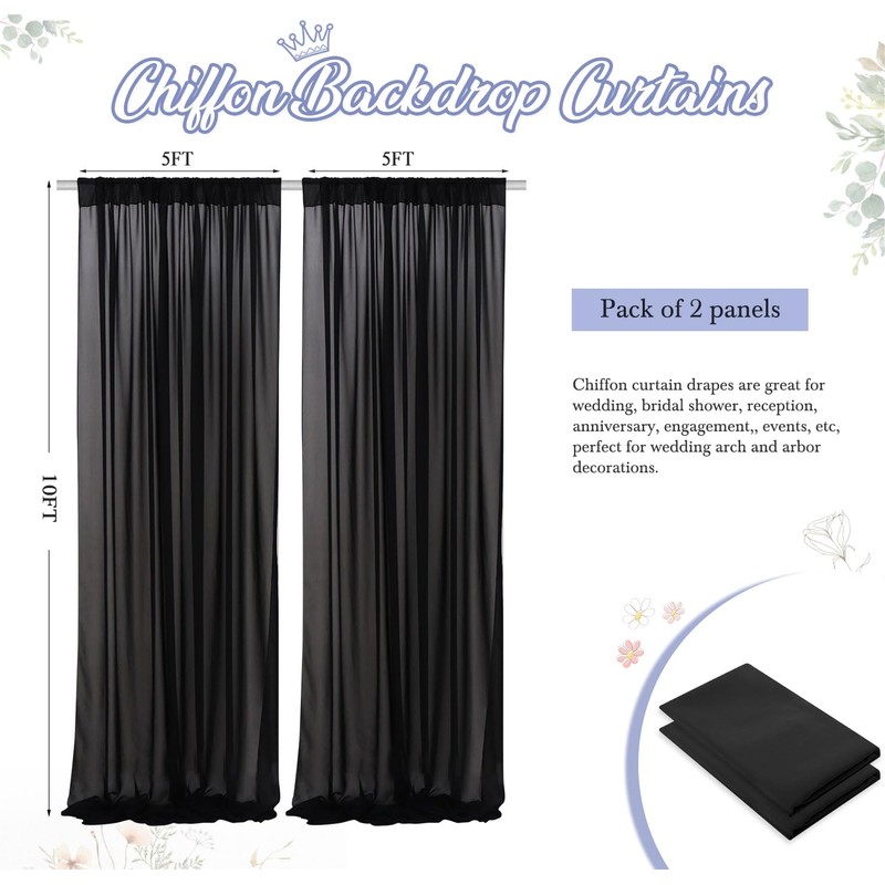 - ★【Size Information - Sheer Backdrop Curtains】The package includes 2 panels 5ft width by 10ft length Black sheer fabric backdrop curtains covering a total area of 10ft width by 10ft length. Our chiffon backdrop panels with 4 inches rod pocket on the top for easy hanging on a pipe or stand. Easily adds a touch of elegance to your wedding or special event.