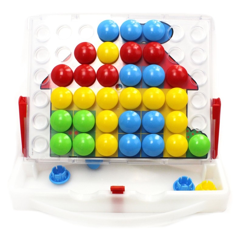 - Large, colourful, age-appropriate plugs with which you can fill a perforated plate through the coloured guides, develops creative skills, hand-eye coordination, as well as the development of dexterity in fine movements and editing