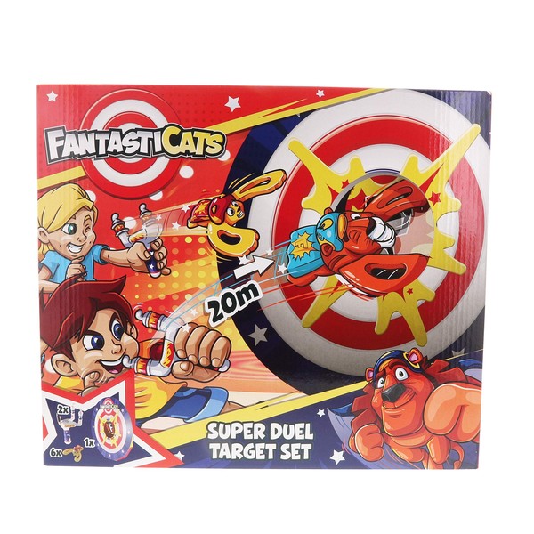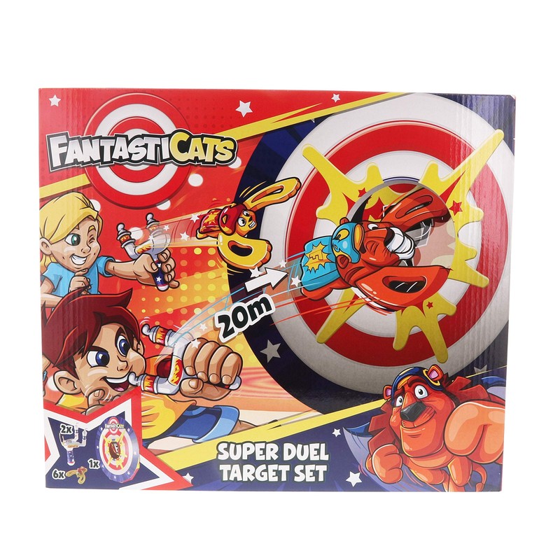 - Includes 1 x target box, 2 x super slingshots and 6 x Fantasticats.