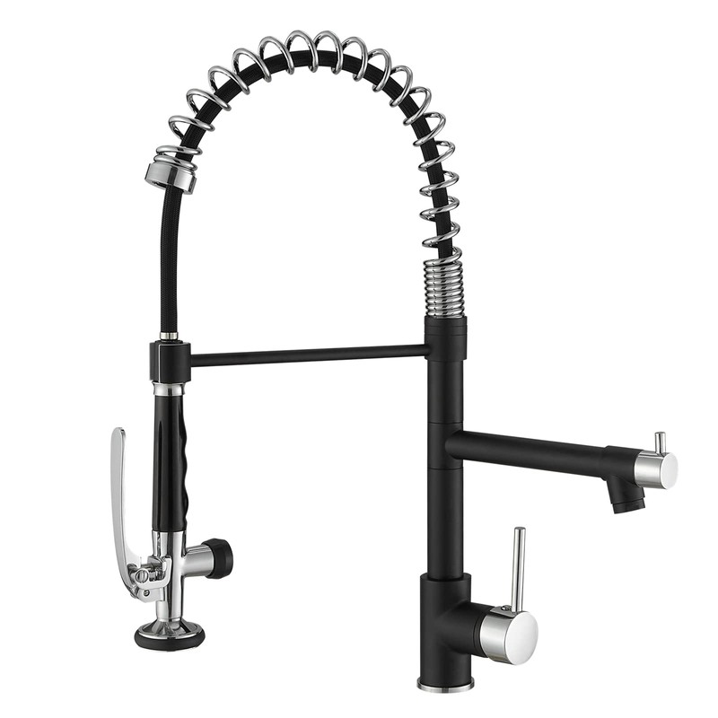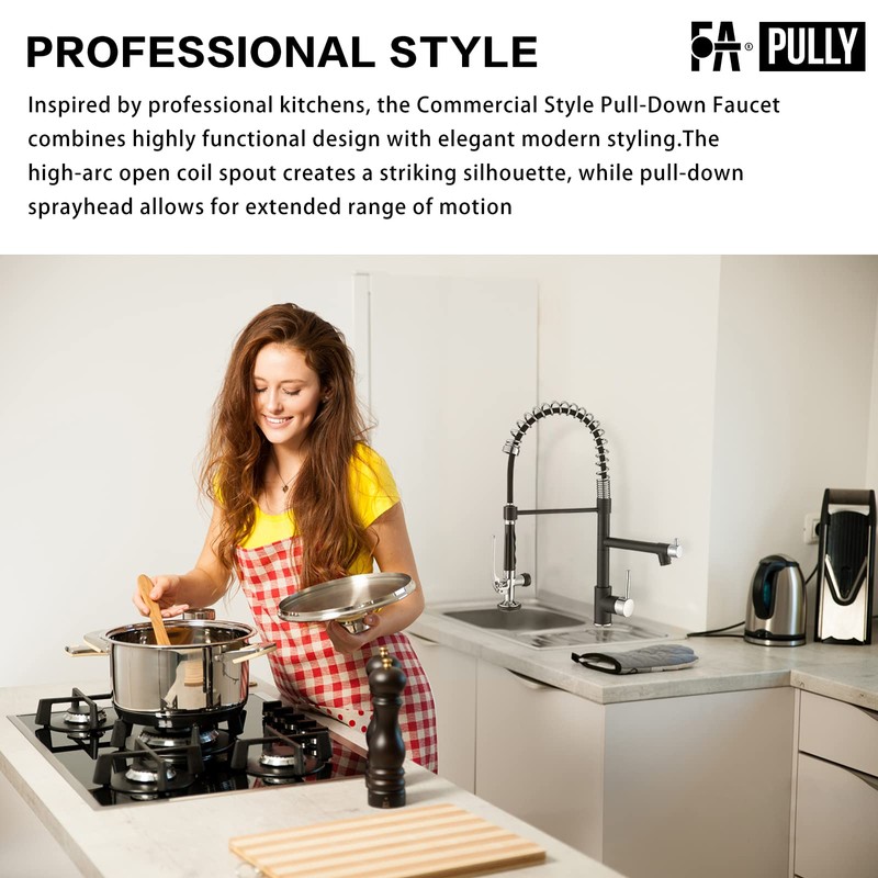 - COMMERCIAL-STYLE KITCHEN FAUCET is both flexible and functional, with a heavy-duty open coil spring spout for an industrial look – PERFECT FIT: Optimized for home use – PULL-DOWN spray head offers an extended range of motion all around the sink. And the pre-rinse faucet ensures high pressure while still saving on water.