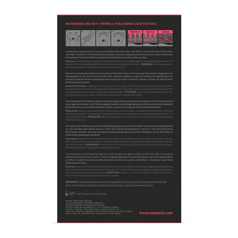 - Rejuvenating hyaluronic acid: the wrinkle patch dissolves an HA complex in the skin that tightens and smooths the forehead. Clinically proven improvement of strength and anti-wrinkle effect after 2 weeks.