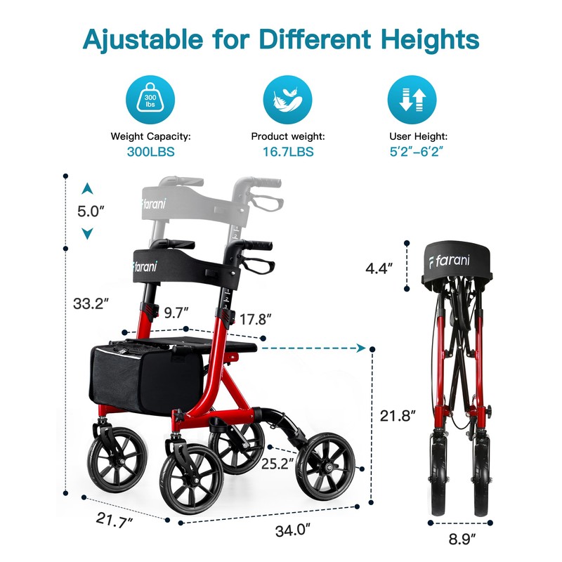 • Walkers for Seniors with seat: Featuring a padded backrest and breathable mesh seat, our walker offers comfortable rest during outdoor walks. It weighs 18.5 pounds and has 6 adjustable height settings (33" - 38"), suitable for users ranging from 5 feet to 6.5 feet tall. It supports a maximum weight capacity of up to 300 pounds.