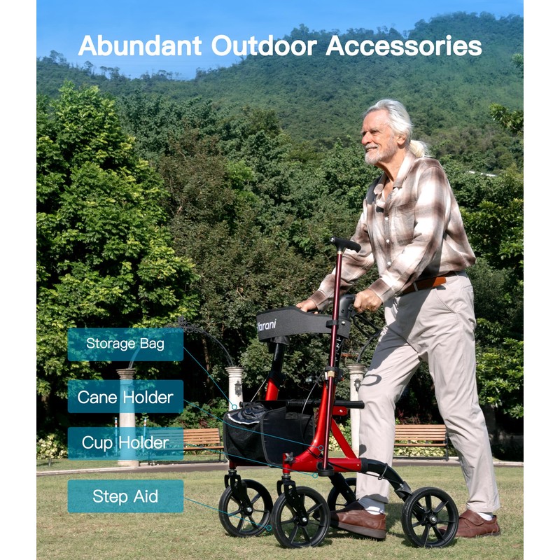 • All-Terrain Non-Slip Tire: The rolling walker is equipped with four 10-inch all-terrain wheels featuring shock-absorbing capabilities, effectively reducing bumps and vibrations during walking. The wheel surface is designed with non-slip patterns to ensure excellent traction and stability on various terrains, enhancing safety and extending tire lifespan.