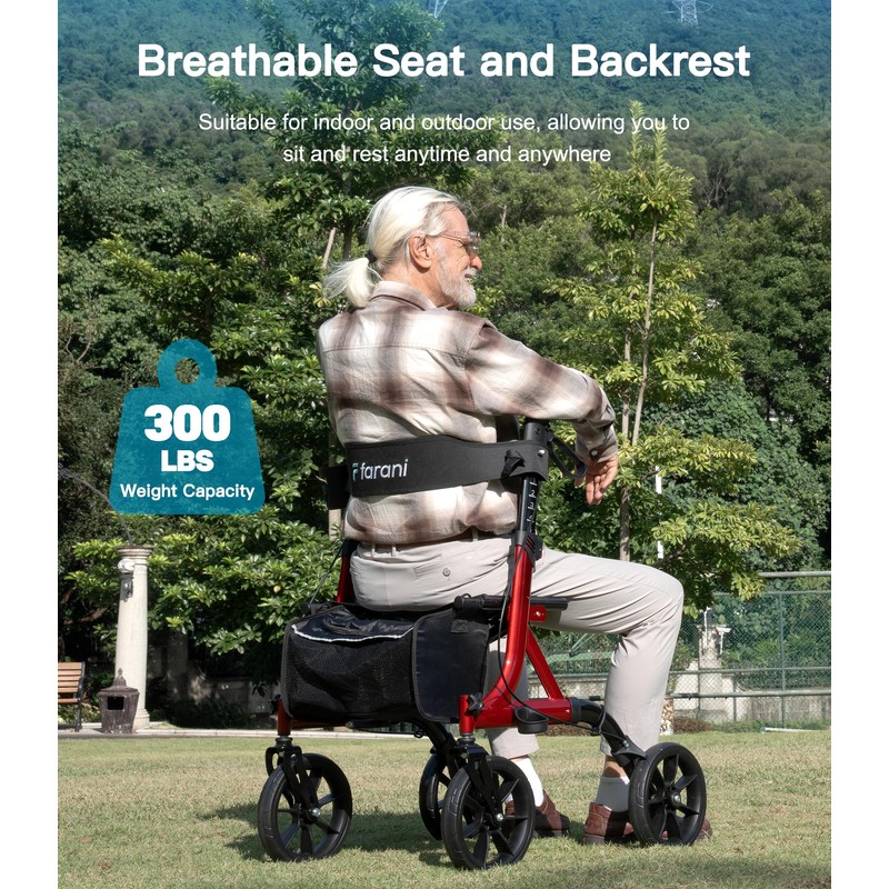 Farani All Terrain Walkers for Seniors - 10" Rubber Wheels, Compact Size Lightweight Foldable Rolling Walker with Seat, Reinforced Triangular Frame Rollator with Cup Holder, 300lbs Weight Capacity