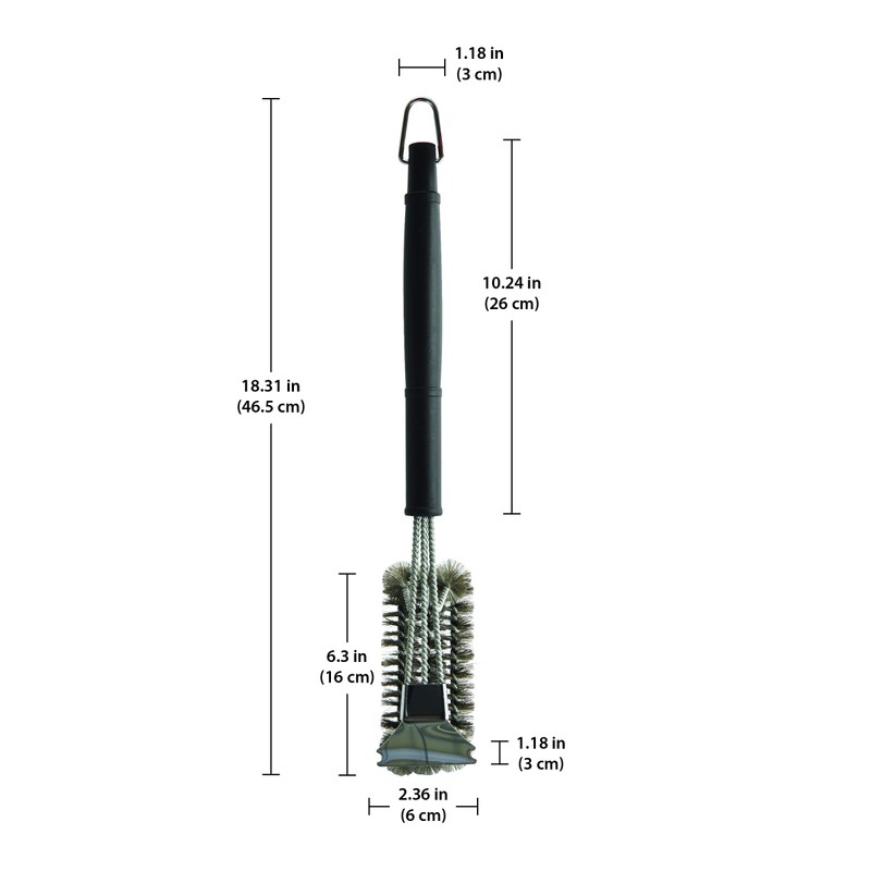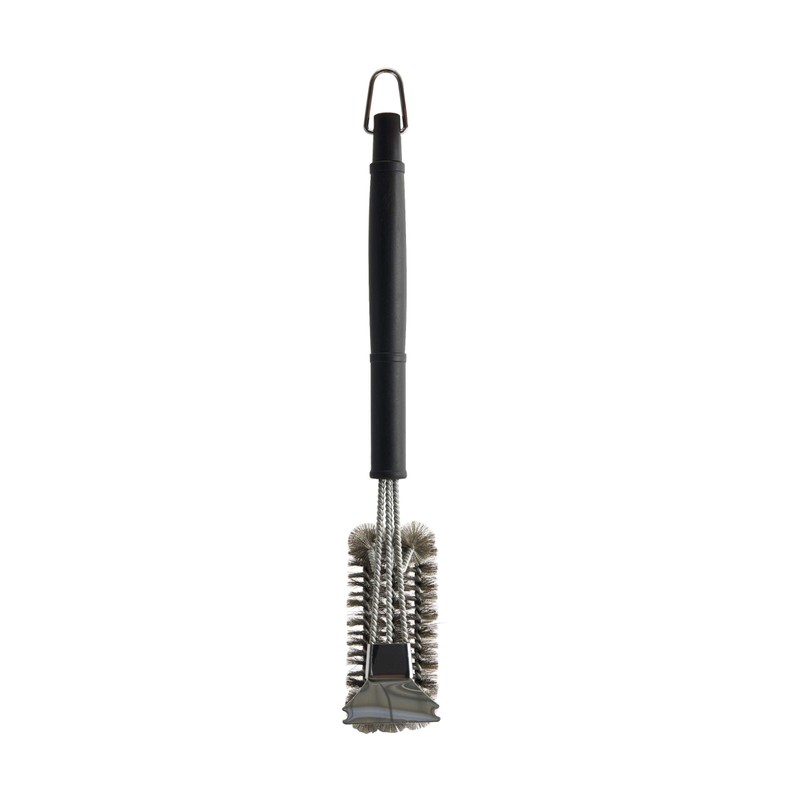 This Farberware BBQ Triple-Head Grill Brush is designed to slip easily between tight grates to clean even the hardest-to-reach areas of your grill. Three, durable, woven stainless steel bristle brushes are strong enough to scour even the toughest gristle and grime off your grill, and the built-in scraper can tackle the hardest stuck on foods. Specially angled for comfort in the hand, the long plastic handle offers extended cleaning motion while in use, and has a loop for hanging storage. Measures 18 inches long.