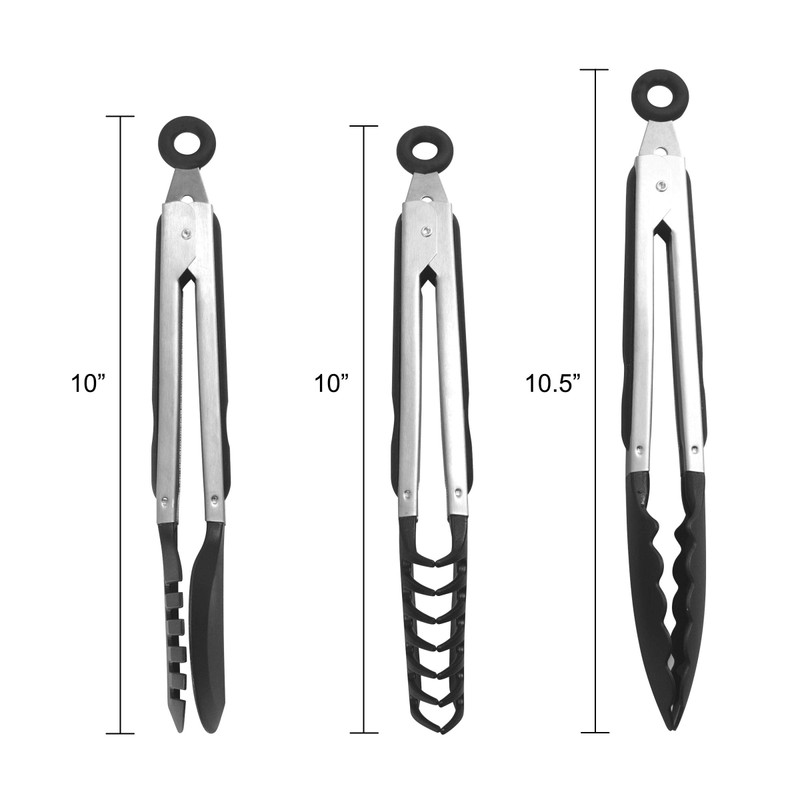 - 3 UNIQUE STYLES: set includes 10-inch tongs with flat edge for flipping meats and vegtables, 10-inch tongs with tines for gripping noodles and pasta, and 10-1/2 inch scalloped tongs for everyday cooking and serving tasks
