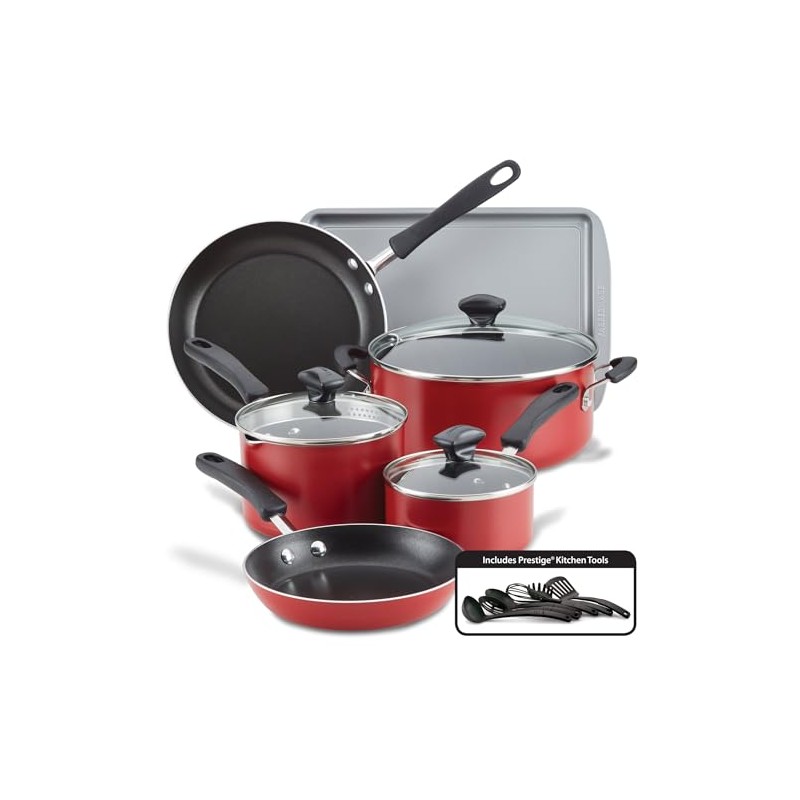 - SET INCLUDES: 1-Quart Covered Saucepan, 2-Quart Covered Straining Saucepan, 5-Quart Covered Dutch Oven, 8- and 9.75-Inch Skillets, 9-Inch by 13-Inch Cookie Sheet, (6) Prestige Nylon Tools: Slotted Turner and Spoon, Solid Spoon, Pasta Fork, Whisk, Ladle