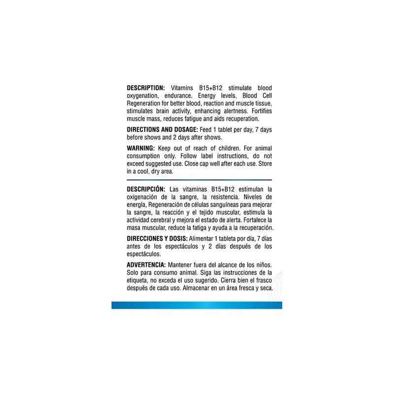 Descripción: La vitamina B12 estimula la producción de glóbulos rojos para mejor transporte de oxígeno a la sangre y músculo.La vitamina B15 estimula la actividad cerebral, mejorando la alerta.Fortalece la masa muscular, reduce la fatiga y ayuda en la recuperación.Beneficios de B-15 y B-12:Ayuda a estimular el sistema inmune.DMG ayuda al cuerpo a utilizar oxígeno más eficientemente.La vitamina B12 mantiene nervios y células sanguíneas saludables.Seguro para gallos adultos.