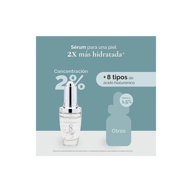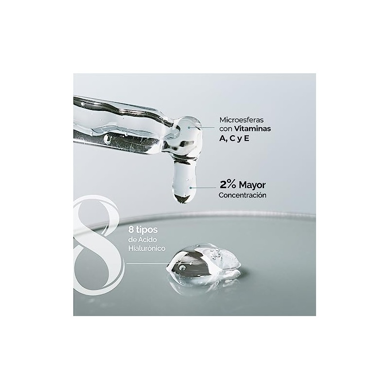 Acerca de este artículo ✅ SÉRUM FACIAL ANTIEDAD con 2% de ácido hialurónico puro. Hidrata profundamente y potencia el colágeno natural, mejorando la elasticidad de la piel. Su fórmula con 8 tipos de ácido hialurónico rejuvenece la piel desde las capas más profundas. 💯 BENEFICIOS: Proporciona un efecto antiedad visible, hidratación profunda y elasticidad. Ayuda a reducir arrugas, líneas finas y signos de fatiga. Además, tiene propiedades antiinflamatorias y regenerantes que mejoran la salud de la piel. 🌿 INGREDIENTES: Contiene un 2% de ácido hialurónico puro y una combinación de vitaminas A, C y E, conocidos por sus propiedades antioxidantes. La fórmula también incluye 8 tipos de ácido hialurónico para un tratamiento intensivo en cada capa de la piel. 👉 MODO DE EMPLEO: Aplicar 2 o 3 gotas del sérum sobre el rostro y cuello previamente limpios.
