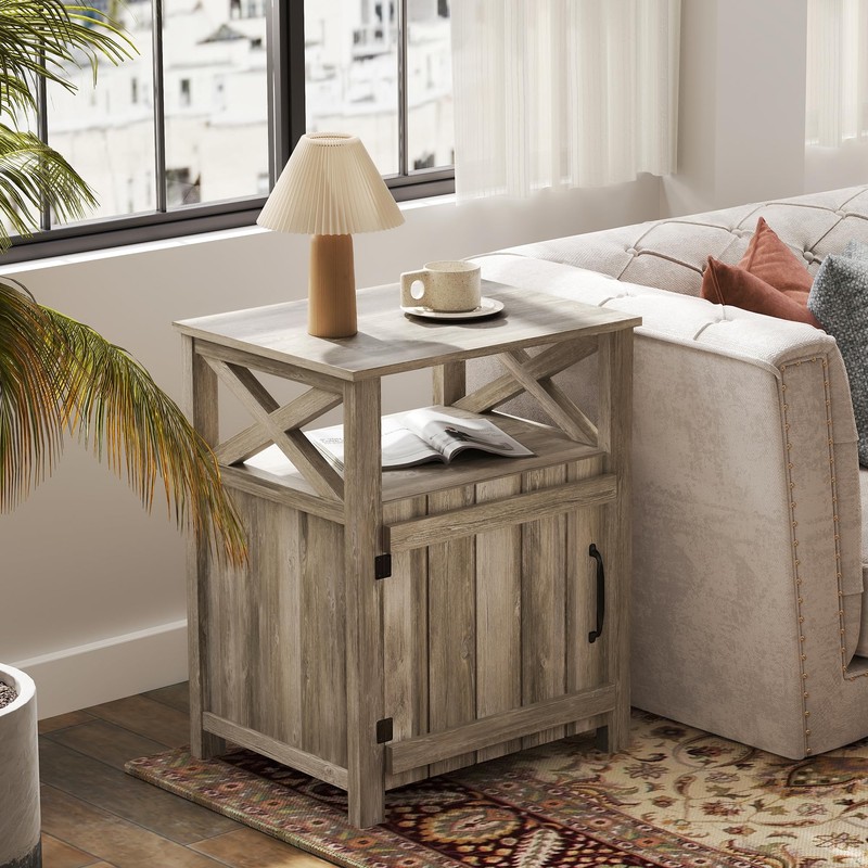 - Storage Masterside Table: Combine with an open compartment and a barn door, this farmhouse nightstand has large space to store batteries, books, glasses, small toys and other sundries. The tabletop of the end table is perfect for displaying a lamp, clock, potted plant or photo frame to offer warmth and personalized decoration.