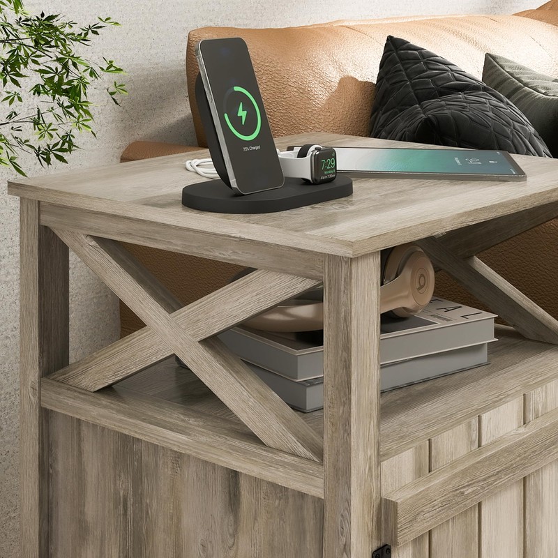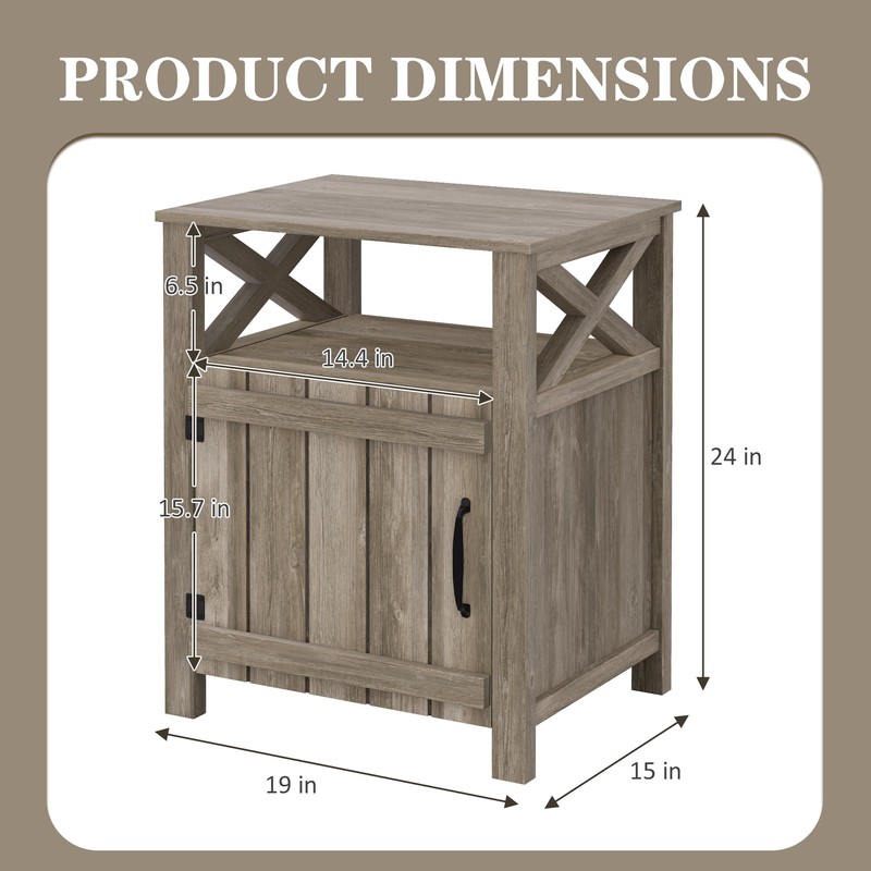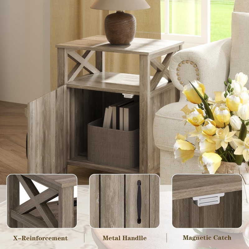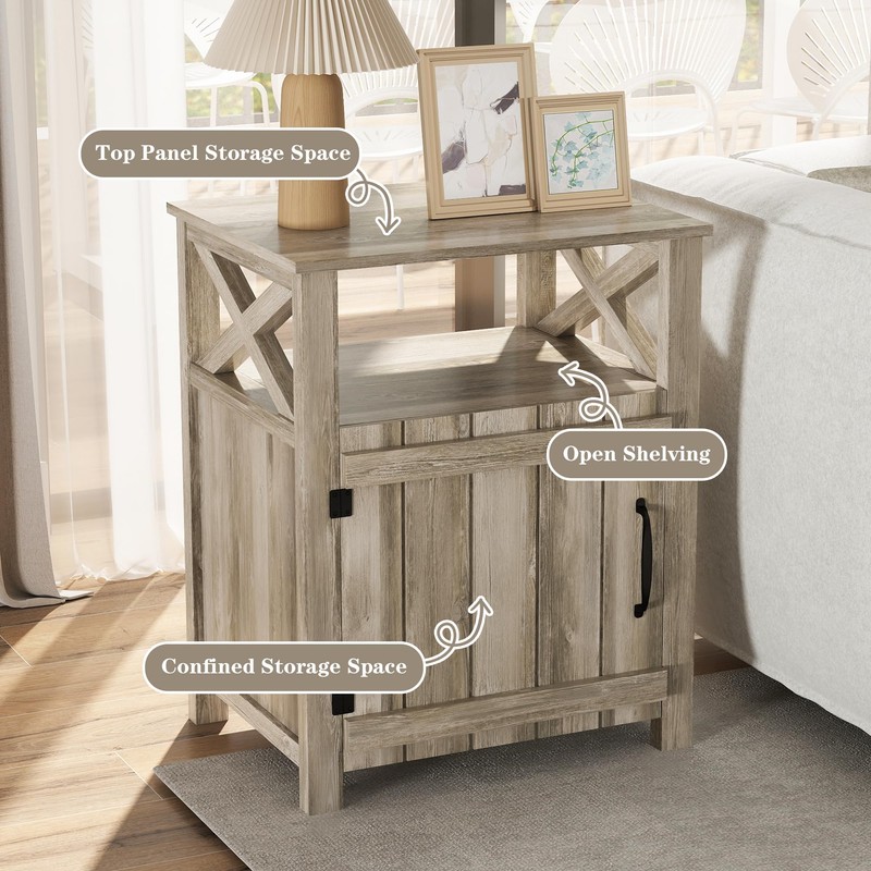 - X Barn Door Farmhouse Nightstand: This nightstand design with a special barn-door pattern on front and two sides, and a metal corner decoration on doors, bringing the atmosphere of a farmhouse to your bedroom and living room. A great addition to your home, making your house more attractive and orderly.