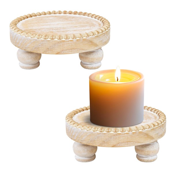 - [RUSTIC CANDLE HOLDER] The farmhouse candle holders feature tray a lightweight and compact design with side bead decorations, creating a sophisticated and classic taste of elegance. Place your favorite pillar candles and display pieces on the round wooden riser, And the classic country style wooden candle holders will become an elegant tabletop decoration.