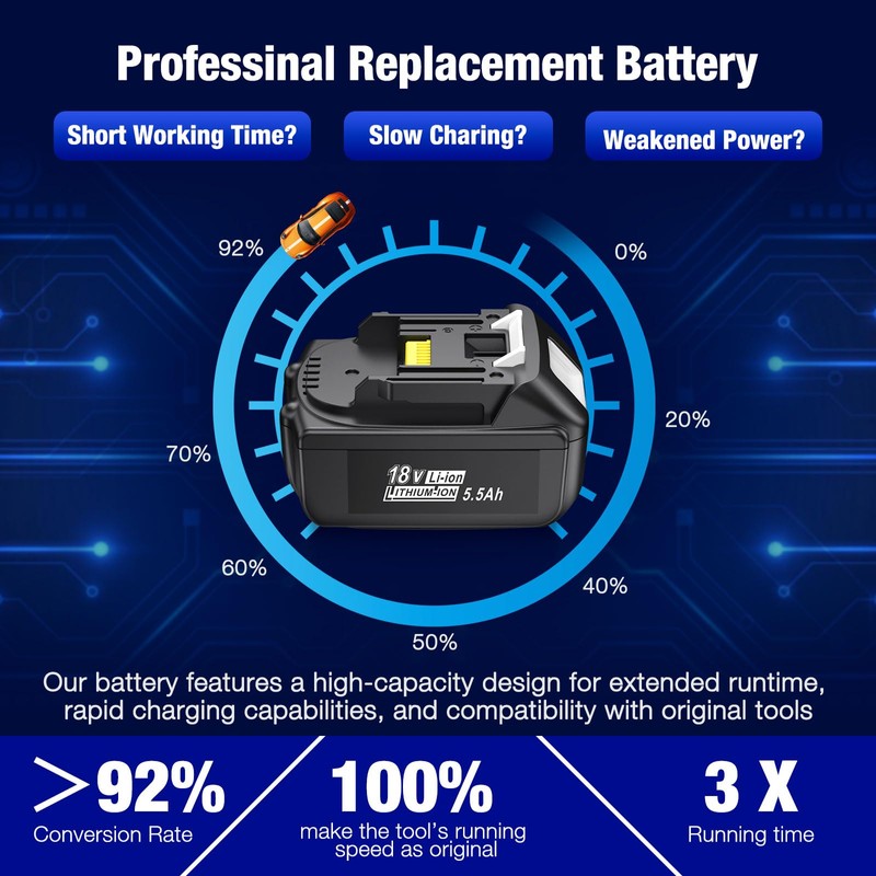 - High-grade performance battery with higher power and better longevity. The LED indicator allows you monitor the remaining battery level, reducing downtime for Makita 18V cordless tools.
