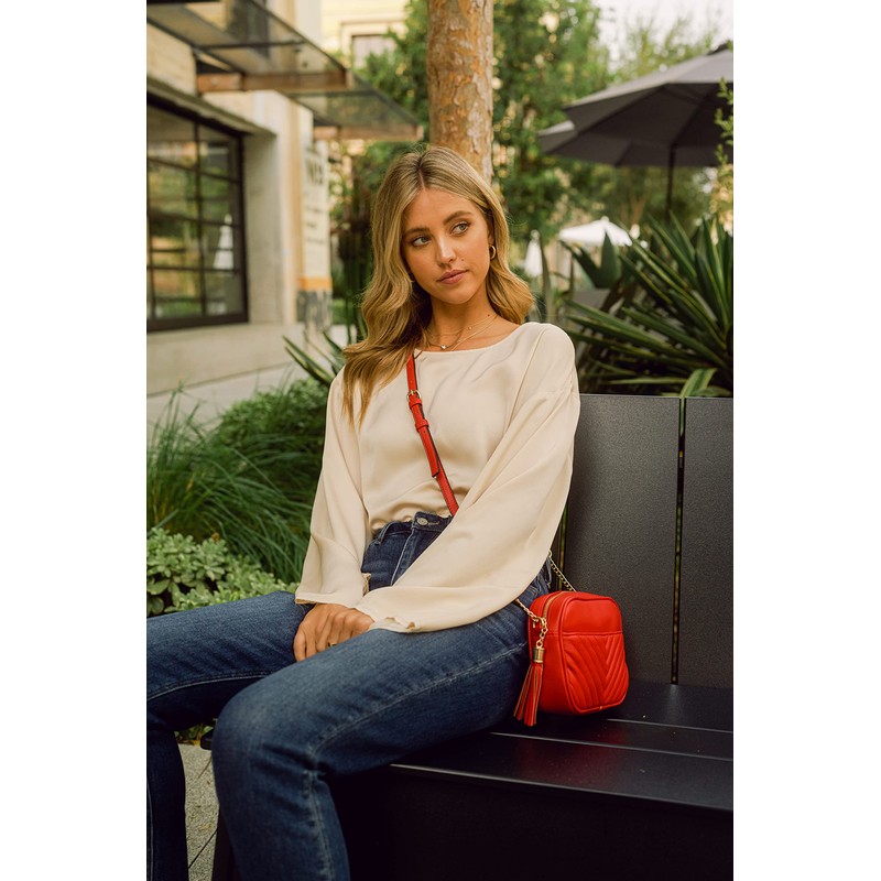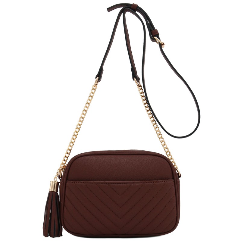 FashionPuzzle Chevron Quilted Crossbody Camera Bag with Chain Strap and Tassel (Coffee)