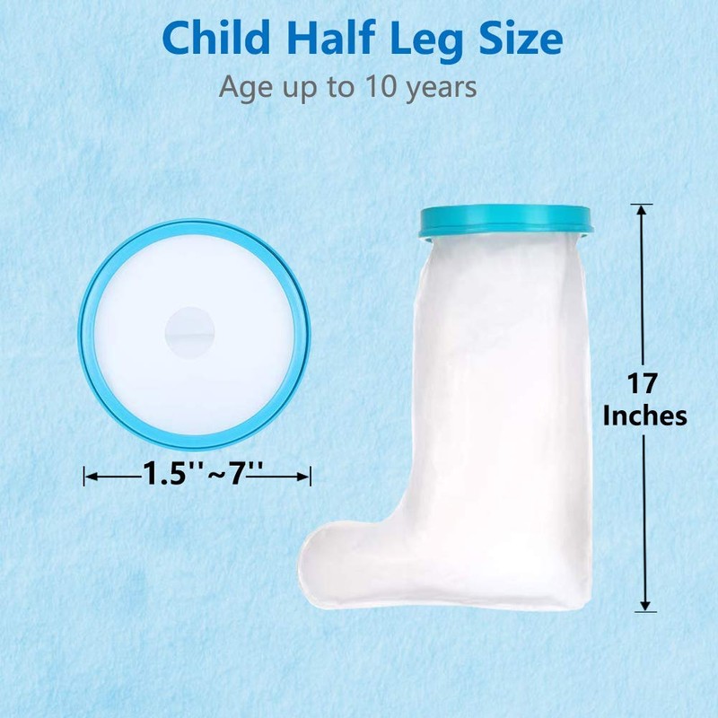 - Cast protection for children: This 17 inch waterproof foot cover is longer enough to cover foot and lower leg injuries. The width is enough for most children and teenagers to easily slide their arm in or out, the centre hole fits an arm diameter of 1.5 to 7 inches and is tight enough to protect your leg or bandage from moisture when showering