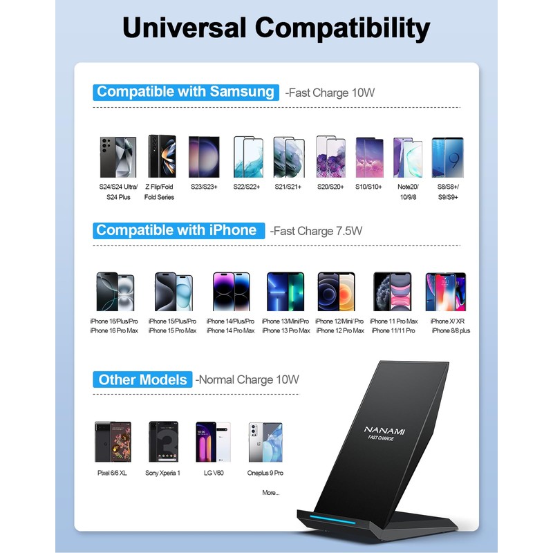 - [Two Wireless Charging Modes] - 10W Fast Charge for Galaxy S25/S25+/S25 Ultra/S24/S24+/S25 Ultra/S23/S23+/S23 Ultra/S22/S22+/S22 Ultra/S21/S21+/S21 Ultra/S20/S20+/S20 and Note 20, required QC 2.0 or above adapter as its power source(Not Included); 7.5W Fast Charge for iPhone 16/16 Plus/16 Pro/16 Pro Max/iPhone 15/15 Pro/15 Pro Max/iPhone 14/14 Pro/14 Pro Max/iPhone 13/13 mini/13 Pro/13 Pro Max/12/12 Pro/12 Pro Max/11/11 Pro/11 Pro Max; 5W Standard Charge for Pixel 3/3XL; Some devices may require an additional wireless Qi receiver like other iPhones.