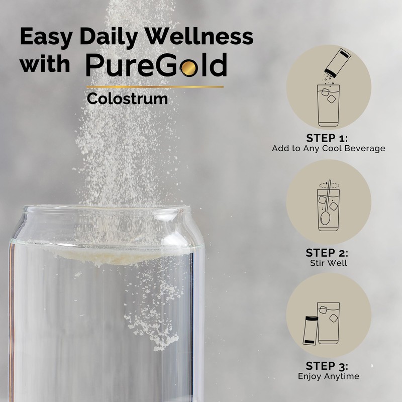 - EASY TO USE TRAVEL PACKS - Taking your daily colostrum supplement is easier than ever with our individual travel packs. Simply tear open one of the individual stick packs and pour into a cool water or beverage. No messy scoops or clean up. We recommend taking colostrum daily with water, on an empty stomach, 20 minutes before you eat. Our grass fed colostrum is cold-processed and minimally processed to ensure you get all the bioactive nutrients. To preserve potency, do not mix Pure Gold colostrum with hot liquids.