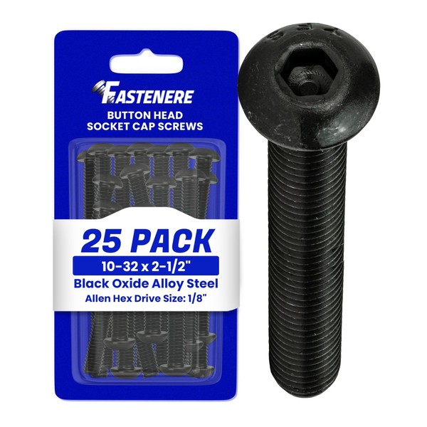 Fastenere Button Head Socket Cap Screws - 10-32 x 2-1/2" (25-Pcs) Alloy Steel, Fully Threaded, Fine Black Oxide Finish, Corrosion-Resistant, Machine Thread, Easy to Install w/Allen Hex Drive