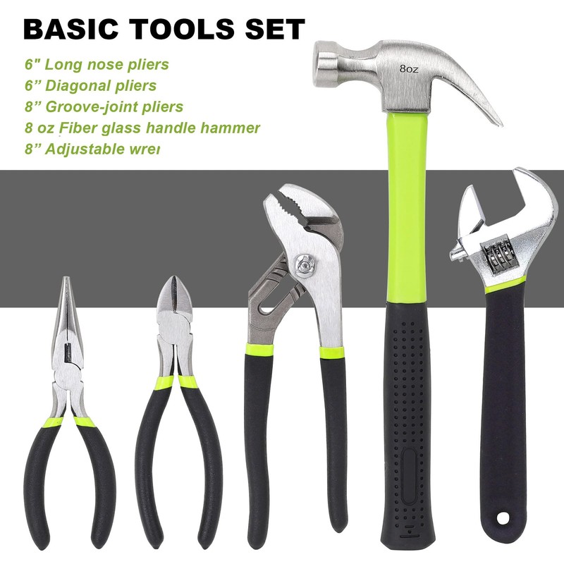 - This tool set comes with all the most basic and necessary tools for work and DIY projects around the house.