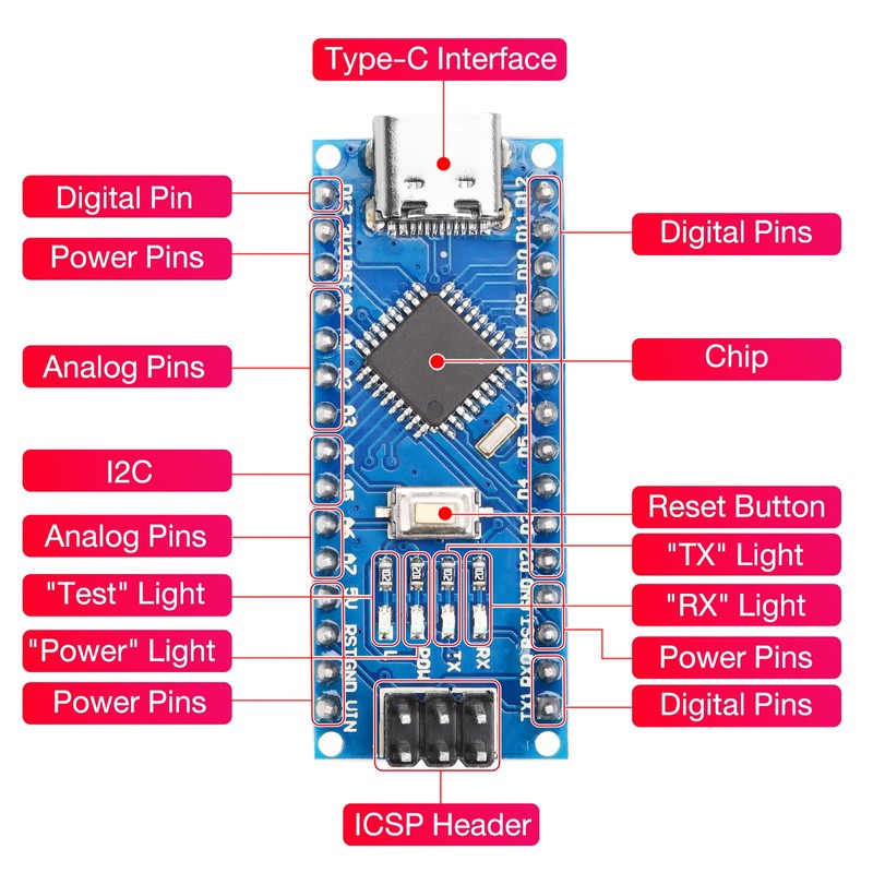 - 8 analogue inputs: TX, RX, D2-D13, chip: CH340