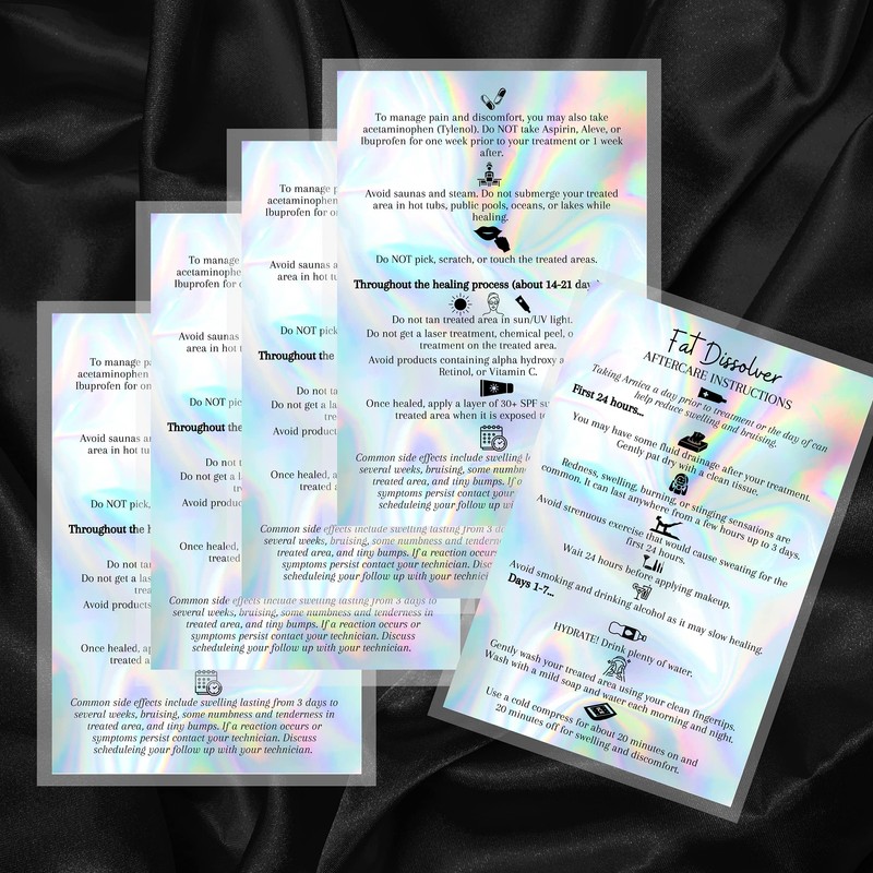 Fat Dissolve Hyaluron Pen Injection Aftercare Card | 30 Pack | Physical Printed 4x6” inches Postcard Size | Non-Reflective Matte Holographic Look Design