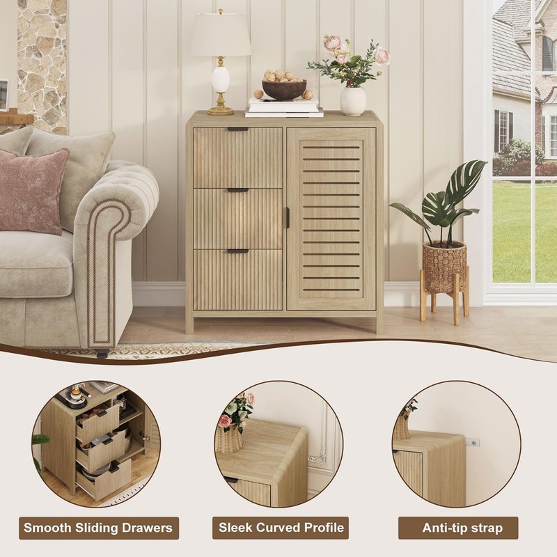 - [Sideboard with waveform fluted-drawers]: This sideboard and buffet cabinet features 3 waveform fluted-drawers and a door. The cabinet top features a curved edge design to prevent accidental injuries. And waveform fluted-drawer fronts add an elegant texture to this cabinet. The light walnut wood grain color that not only blends perfectly with a variety of home styles, but also adds a natural harmony and serenity to your living room