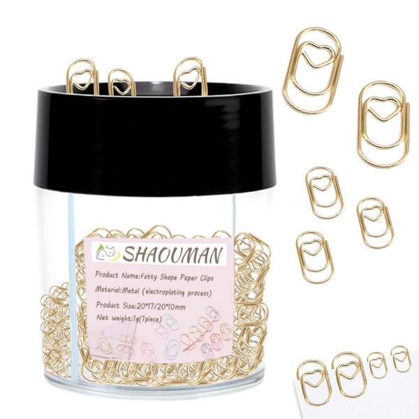 Fatty Shape Paper Clips Anti-Rust Non-Slip Design, Multi-Color Set with Magnetic Paper Clips Holder for Office School (Gold, Small/Medium)