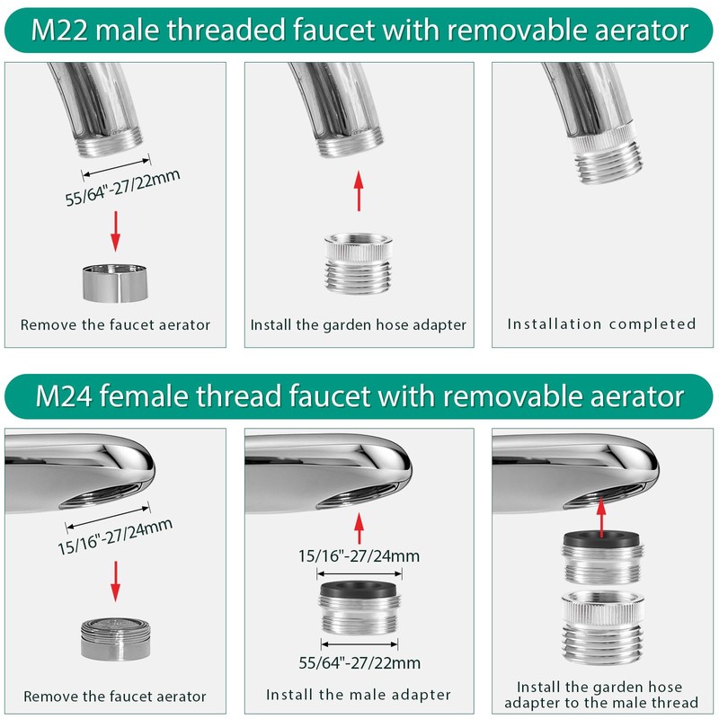 - THREAD SPECIFICATION: Please note that this faucet adapter is only suitable for faucets with removable aerators. If your faucet has an M22 external thread, you can directly connect this adapter; if your faucet has an M24 internal thread, it can also be used. We have equipped you with a 15/16"-27/24mm internal thread adapter in the package. After installation, you can connect it to a 55/64"-27/22mm garden hose adapter.