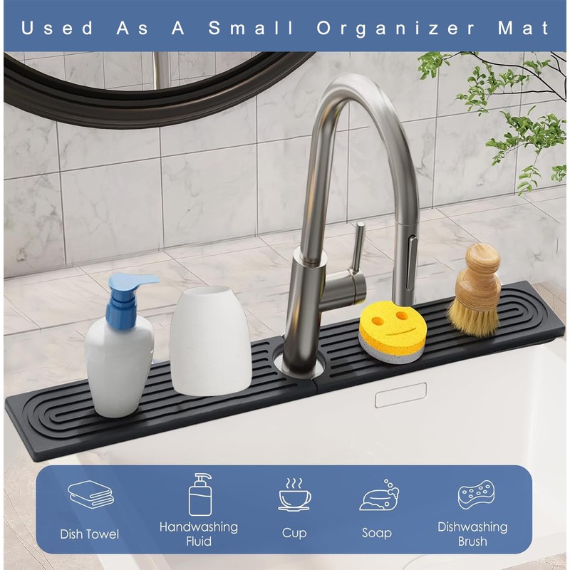 - 【2-in-1 Water Guard & Organizer】 Our sink faucet mat splash guard doubles as a tidy storage tray for soap, cups, toothbrushes, and sponges.Stops sink stains and rust while keeping essentials neatly accessible.Transform messy countertops into clutter-free zones instantly