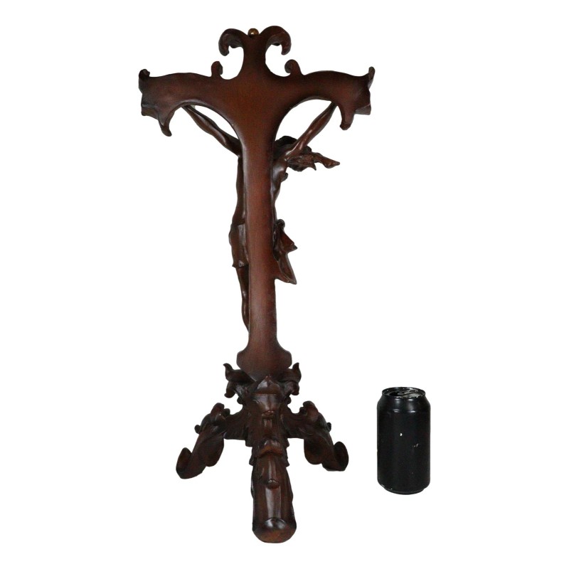 • Jesus Christ, the savior and redeemer of men, is featured here on the cross in mahogany faux wood finish. The Crucifix is designed in traditional style, with tripod base feature symbolizing the Trinity; God, The Son and The Holy Spirit. Close to the foot of the crucifix is the word INRI in gold.