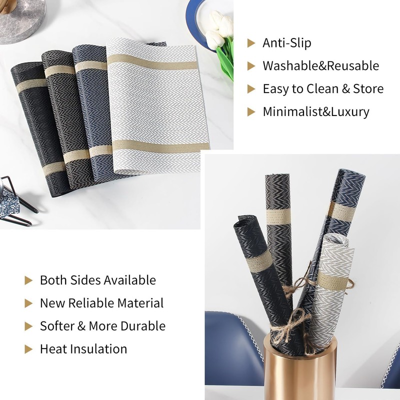 - Perfect Practicability:Blue Vinyl Placemats:Both sides available. High Texture, wipeable and washable, easy to clean, non-slip, heat resistant, match well with your tables and protect your tables from scratches and stains