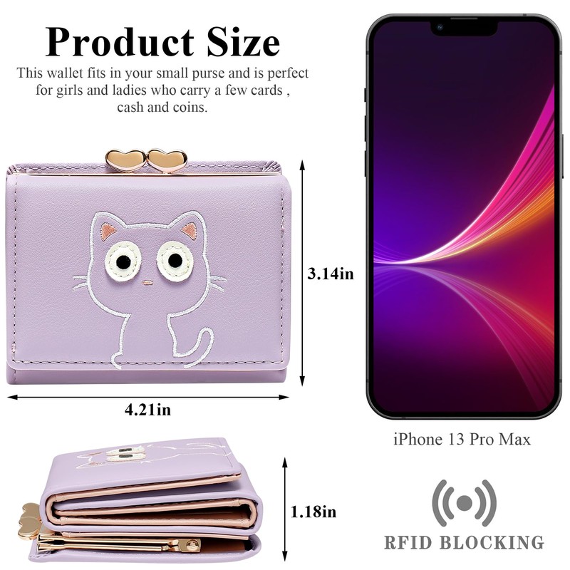 - INGENIOUS DESIGN -- This women small trifold wallet is designed with heart-shaped snap closure and embroidered kitten on the front to bring you a brighter mood whenever you see it. It has 1 clear heart-shaped ID window, 1 cash section and 7 card slots to keep all your essentials organized.